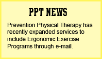 Welcome to Prevention Physical Therapy Industrial & Ergonomic Department. Prevention Physical Therapy is an ergonomic alternative consulting firm that specializes in rehabilitation, decreasing workers compensation claims, and reducing direct & indirect costs. This approach improves the productivity of your employees, and at the same time increases your company's overall profit. Our company's industrial physical therapists specialize in work place safety and fatigue reduction programs. For further information on the services that Prevention Physical Therapy provides, please choose from the menu to your left. If you have any questions, please feel free to "Contact Us". Thank you for visiting Prevention Physical Therapy.